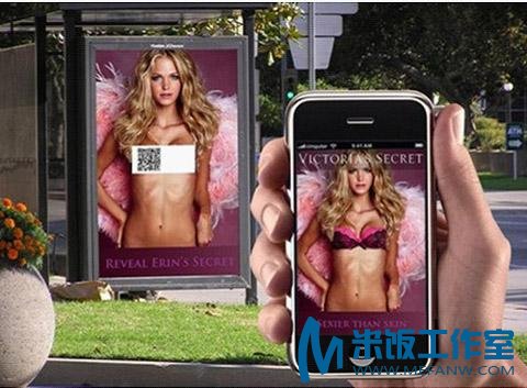 著名内衣品牌维多利亚做了一个很有范儿的户外广告,在模特前胸盖上二维码,广告文案更是赤裸裸地充满诱惑——“Reveal Lily’s secret”(Lily的真实秘密),让你亟不可待地拿起手机拍摄二维码,原来二维码的后面是维多利亚的秘密内衣,真的如广告语所说的那样,“比肌肤更性感”。